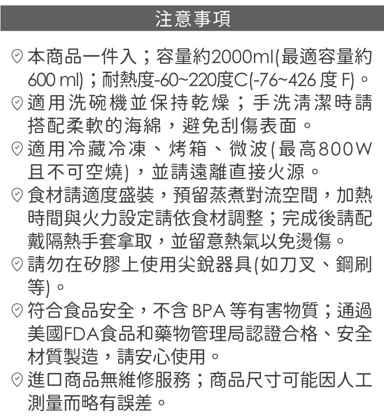 品牌:西班牙 LEKUE材質:白金矽膠尺寸:展開時長 28 x 寬 25 x 高 13 cm;扣起時長 32.5 x 寬 13.5 x 高 14.5 cm容量:約 2000 ml (最適容量約 600 ml)重量:500 g產地:中國