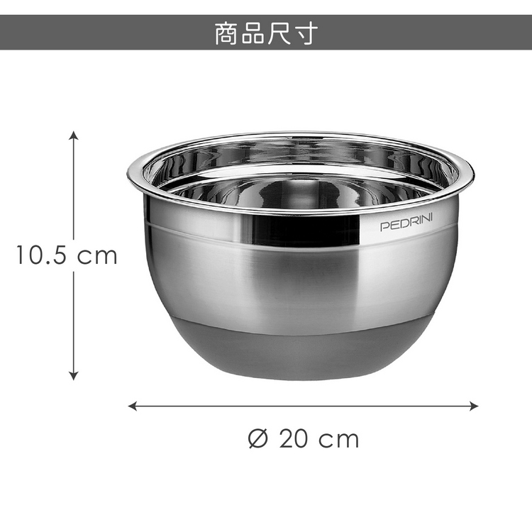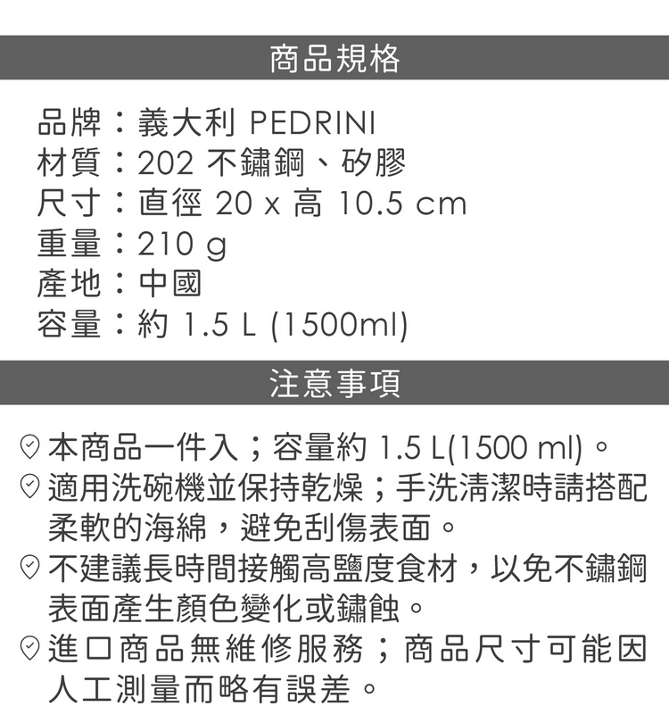 品牌:義大利 PEDRINI材質:202 不鏽鋼、矽膠尺寸:直徑 20 x 高 10.5 cm重量:210 g產地:中國容量:約 1.5 L (1500ml)