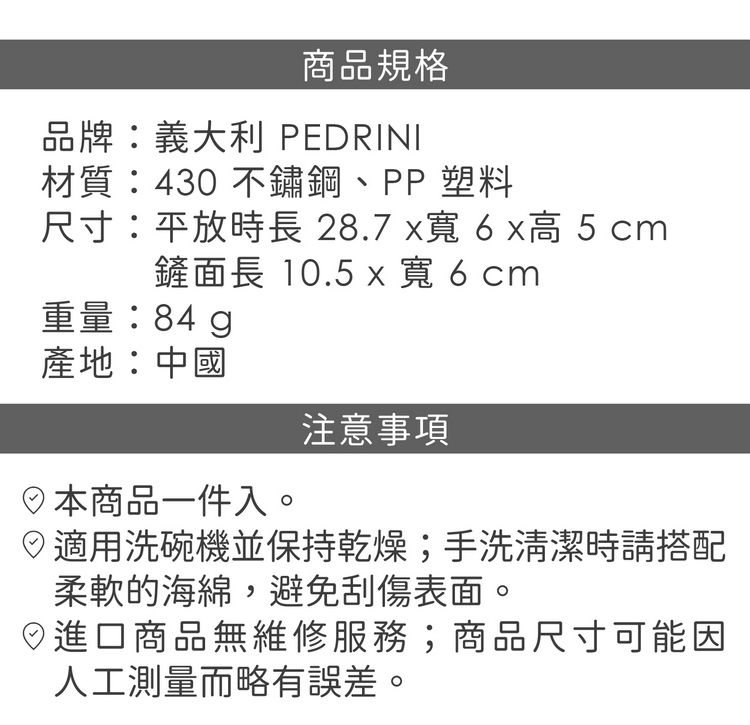 品牌:義大利 PEDRINI材質:430 不鏽鋼、PP 塑料尺寸:平放時長 28.7 x寬 6 x高 5 cm;鏟面長 10.5 x 寬 6 cm重量:84 g產地:中國