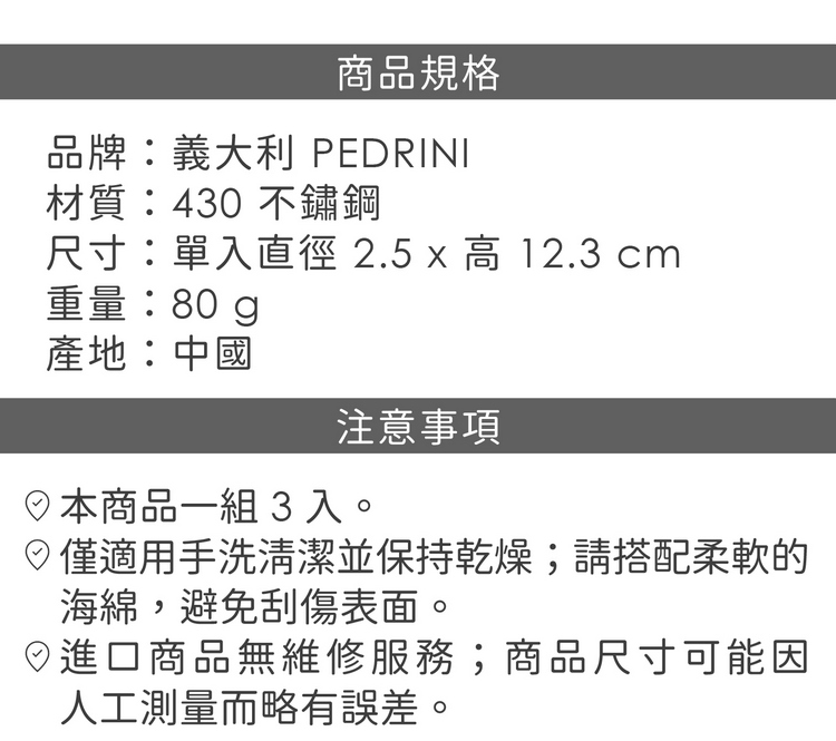 品牌:義大利 PEDRINI材質:430 不鏽鋼尺寸:單入直徑 2.5 x 高 12.3 cm重量:80 g產地:中國