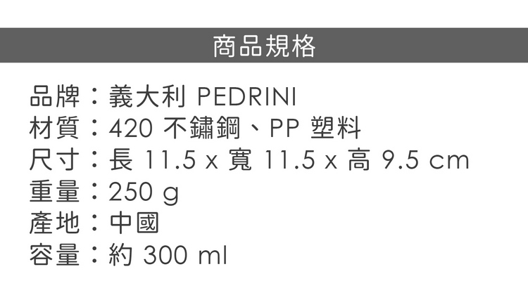 品牌:義大利 PEDRINI材質:420 不鏽鋼、PP 塑料尺寸:長 11.5 x 寬 11.5 x 高 9.5 cm重量:250 g產地:中國容量:約 300 ml