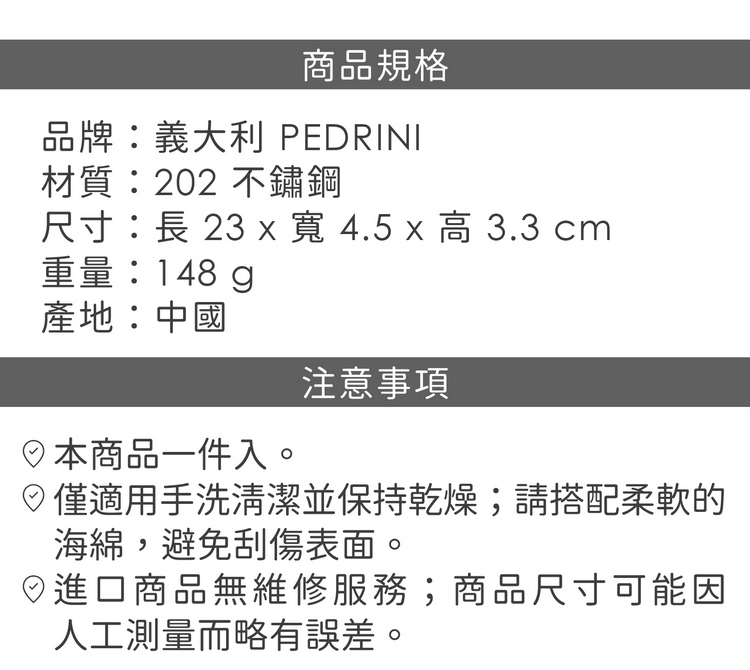 品牌:義大利 PEDRINI材質:202 不鏽鋼尺寸:長 23 x 寬 4.5 x 高 3.3 cm重量:148 g產地:中國