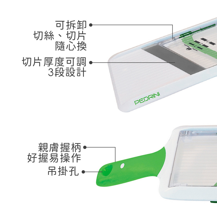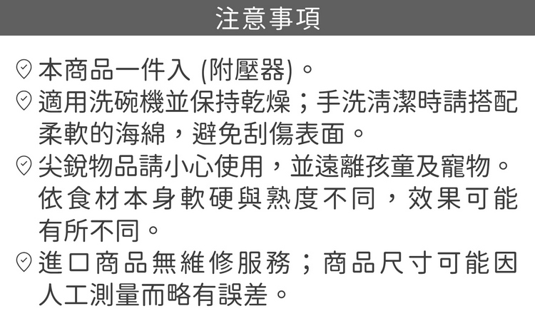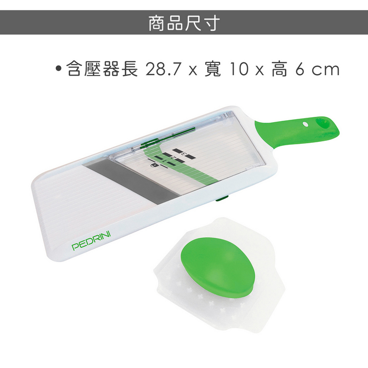 品牌:義大利 PEDRINI材質:420 不鏽鋼、ABS 塑料尺寸:含壓器長 28.7 x 寬 10 x 高 6 cm;刨片刀面寬 8.5 cm;圓刨孔直徑 0.5 cm重量:245 g產地:中國