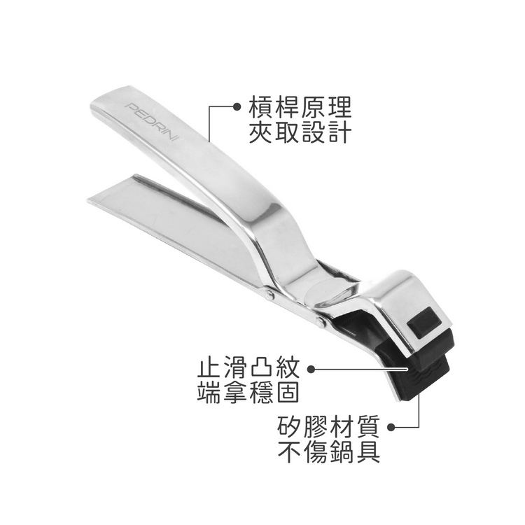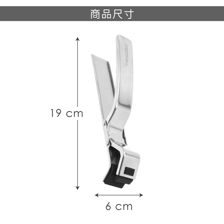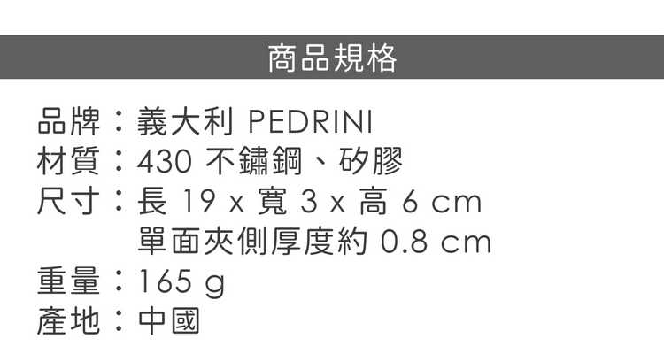 品牌:義大利 PEDRINI材質:430 不鏽鋼、矽膠尺寸:長 19 x 寬 3 x 高 6 cm;單面夾側厚度約 0.8 cm重量:165 g產地:中國