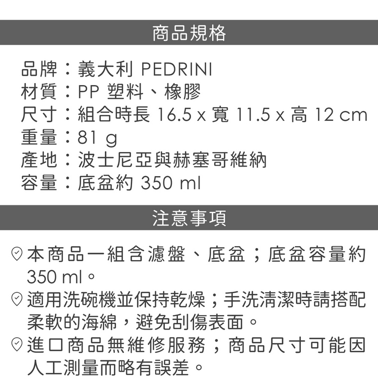 品牌:義大利 PEDRINI 材質:PP 塑料、橡膠 尺寸:組合時長 16.5 x 寬 11.5 x 高 12 cm 重量:81 g 產地:中國 容量:底盆約 350 ml