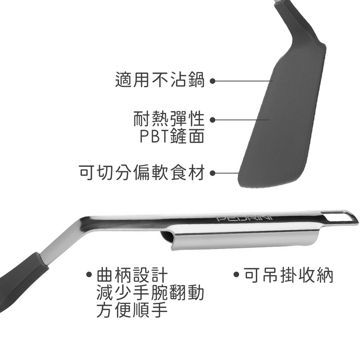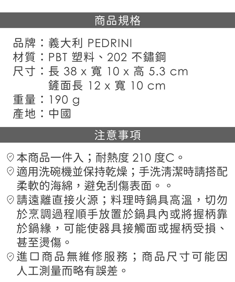 品牌:義大利 PEDRINI材質:PBT 塑料、202 不鏽鋼尺寸:長 38 x 寬 10 x 高 5.3 cm;鏟面長 12 x 寬 10 cm重量:190 g產地:中國