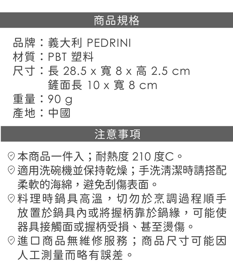 品牌:義大利 PEDRINI材質:PBT 塑料尺寸:長 28.5 x 寬 8 x 高 2.5 cm;鏟面長 10 x 寬 8 cm重量:90 g產地:中國