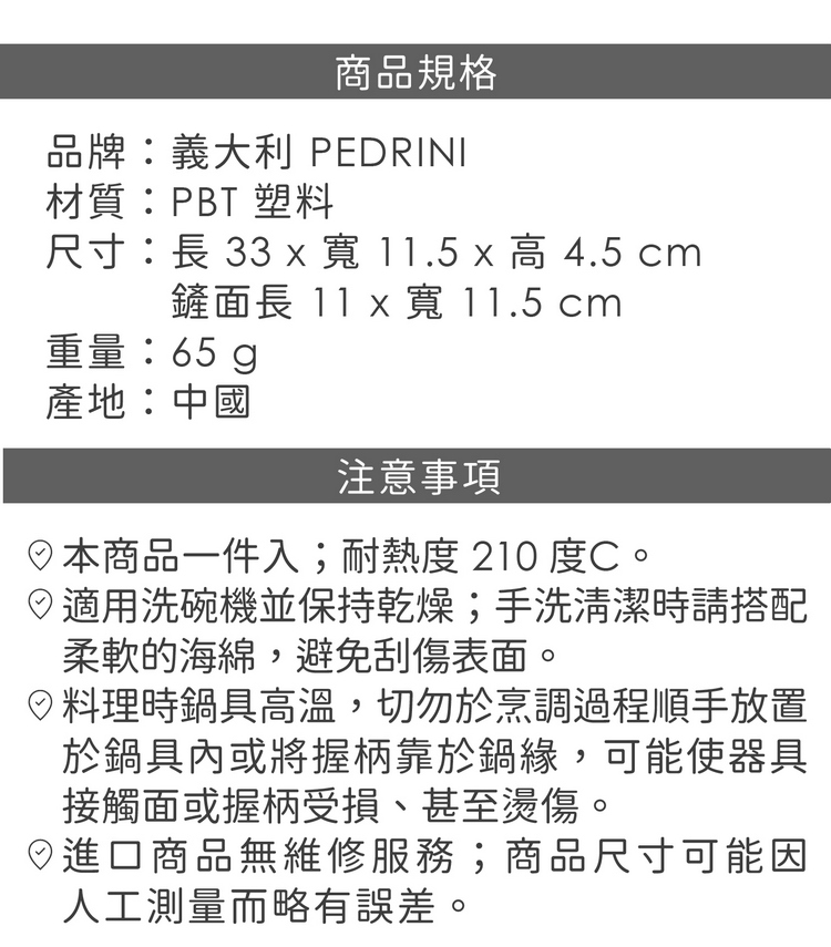 品牌:義大利 PEDRINI材質:PBT 塑料尺寸:長 33 x 寬 11.5 x 高 4.5 cm;鏟面長 11 x 寬 11.5 cm重量:65 g產地:中國