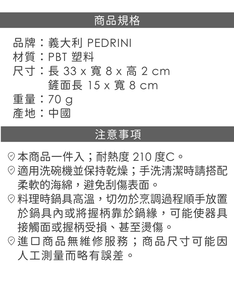 品牌:義大利 PEDRINI材質:PBT 塑料尺寸:長 33 x 寬 8 x 高 2 cm;鏟面長 15 x 寬 8 cm重量:70 g產地:中國