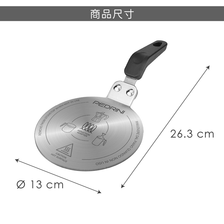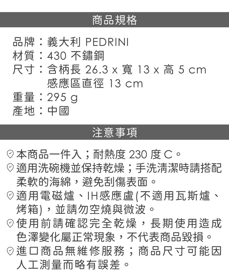 品牌:義大利 PEDRINI材質:430 不鏽鋼尺寸:含柄長 26.3 x 寬 13 x 高 5 cm;感應區直徑 13 cm重量:295 g產地:中國