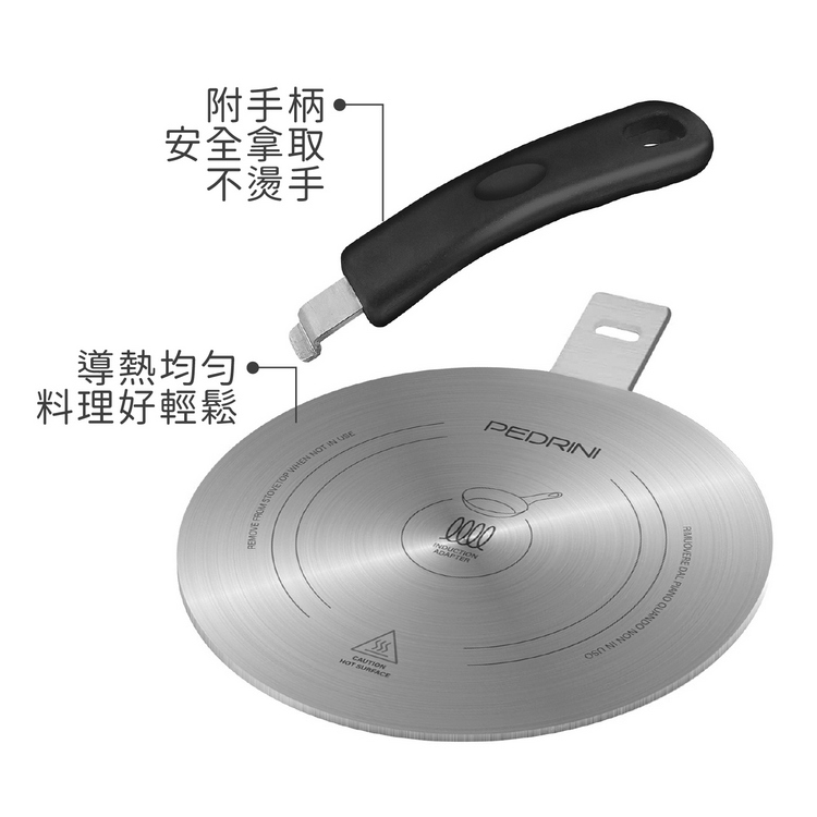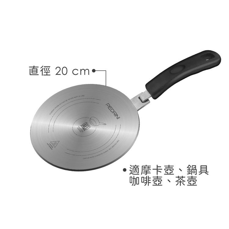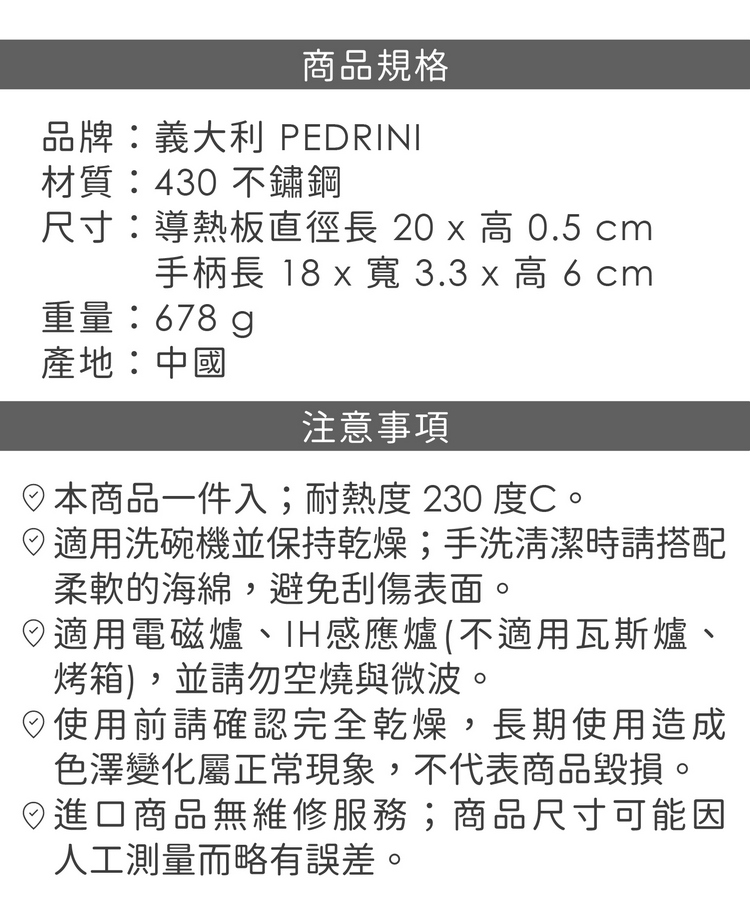 品牌:義大利 PEDRINI材質:430 不鏽鋼尺寸:導熱板直徑長 20 x 高 0.5 cm;手柄長 18 x 寬 3.3 x 高 6 cm重量:678 g產地:中國