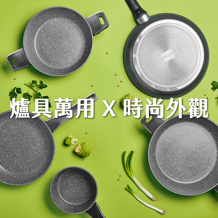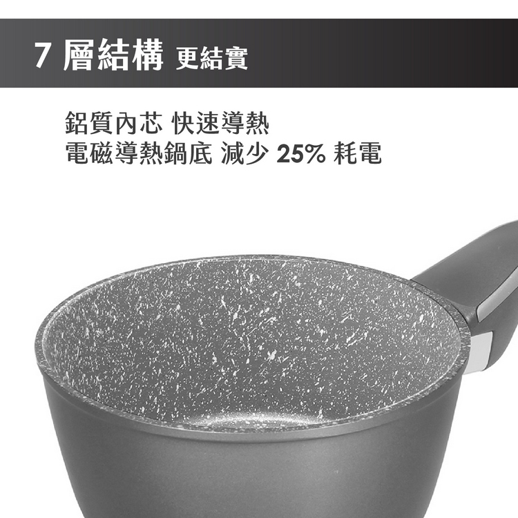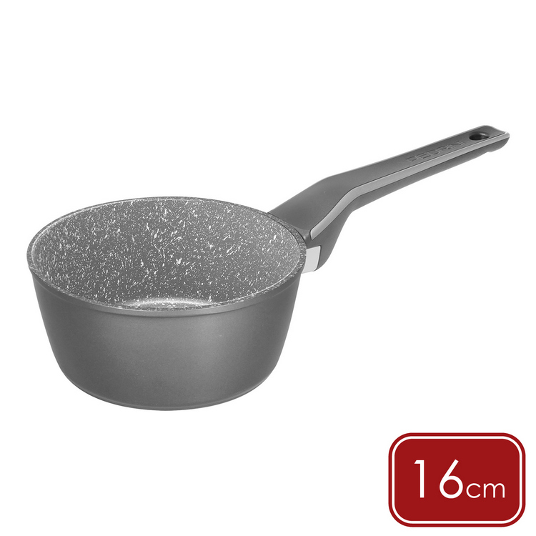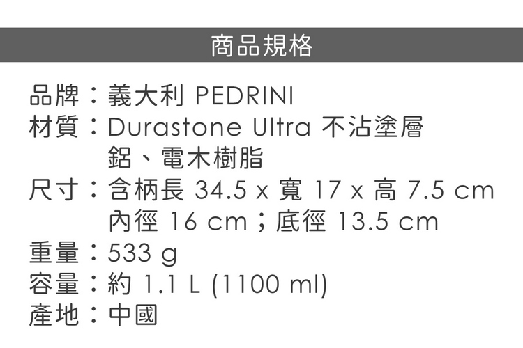 品牌:義大利 PEDRINI材質:Durastone Ultra 不沾塗層、鋁、電木樹脂尺寸:含柄長 34.5 x 寬 17 x 高 7.5 cm;內徑 16 cm;底徑 13.5 cm重量:533 g容量:約 1.1 L (1100 ml)產地:中國