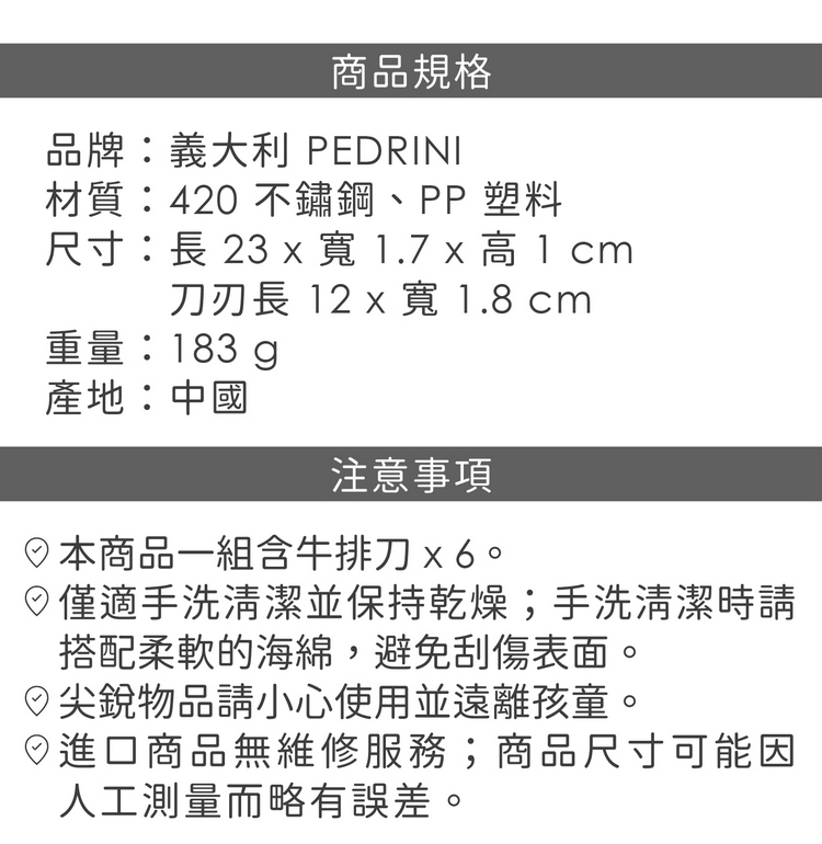 品牌:義大利 PEDRINI材質:420 不鏽鋼、PP 塑料尺寸:長 23 x 寬 1.7 x 高 1 cm;刀刃長 12 x 寬 1.8 cm重量:183 g產地:中國