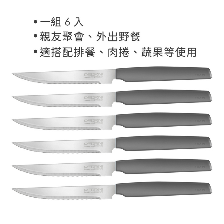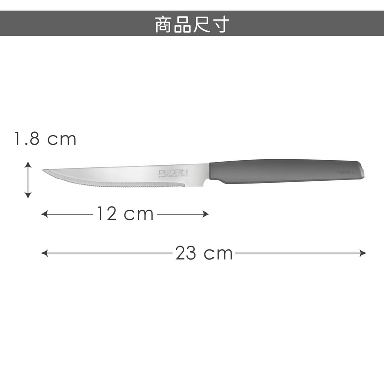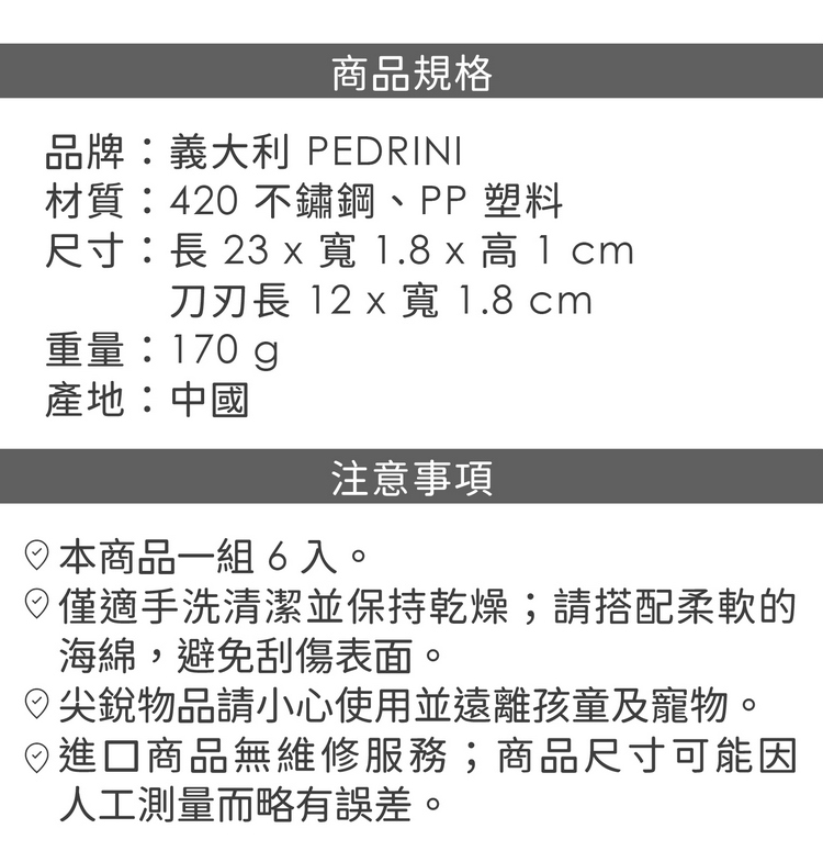 品牌:義大利 PEDRINI材質:420 不鏽鋼、PP 塑料 尺寸:長 23 x 寬 1.8 x 高 1 cm;刀刃長 12 x 寬 1.8 cm重量:170 g產地:中國