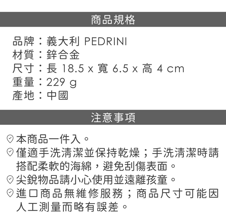 品牌:義大利 PEDRINI材質:鋅合金尺寸:長 18.5 x 寬 6.5 x 高 4 cm重量:229 g產地:中國