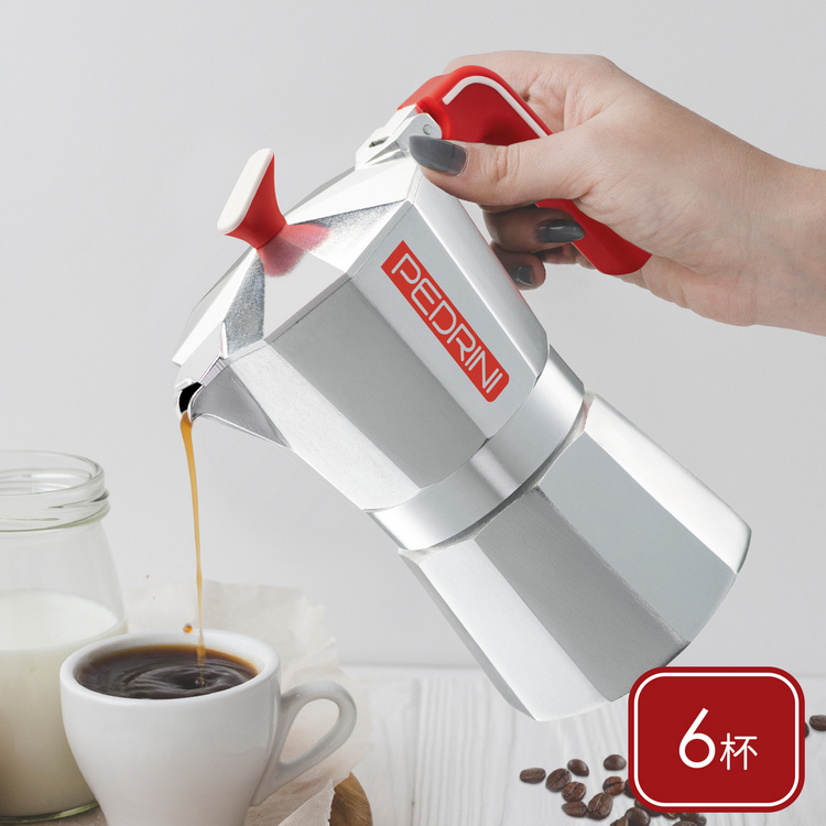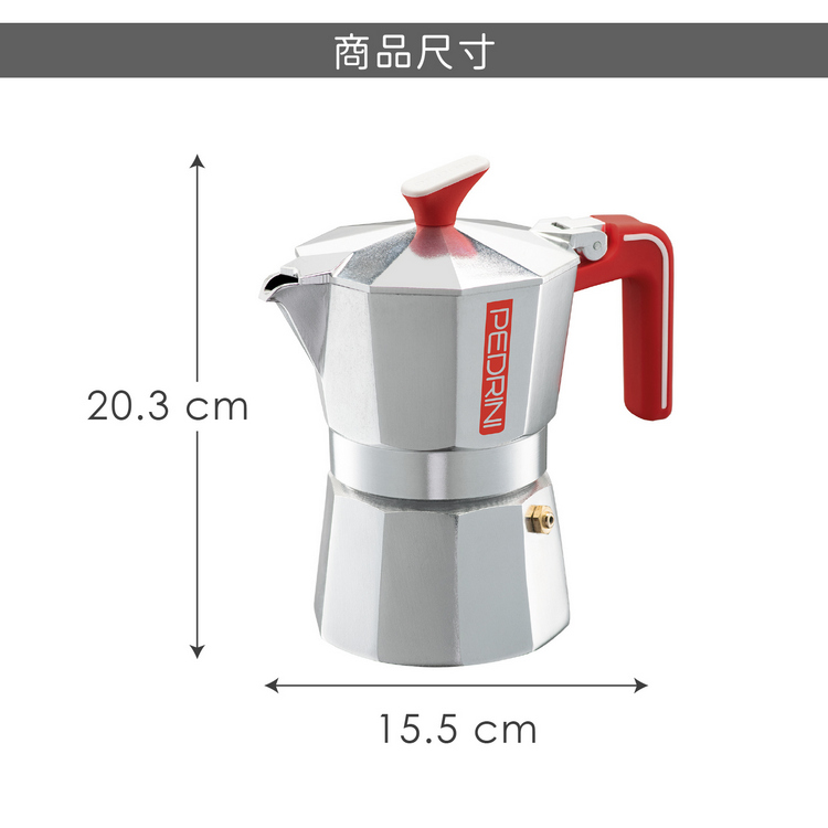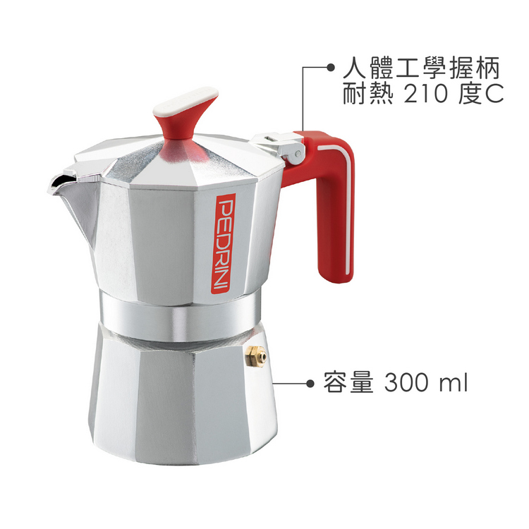 品牌:義大利 PEDRINI材質:再生食品級鋁合金EN601、矽膠、尼龍尺寸:含壺耳長 15.5 x 寬 10.5 x 高 20.3 cm;底徑 9 cm重量:575 g產地:中國容量:約 300 ml (6杯量)