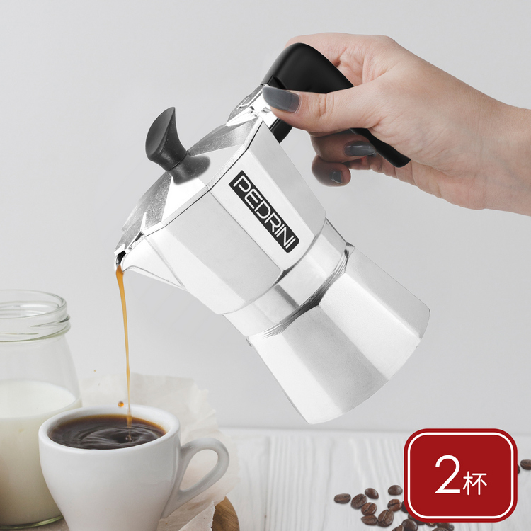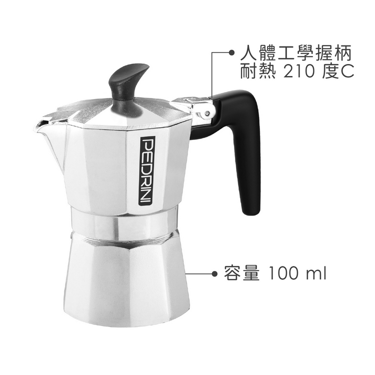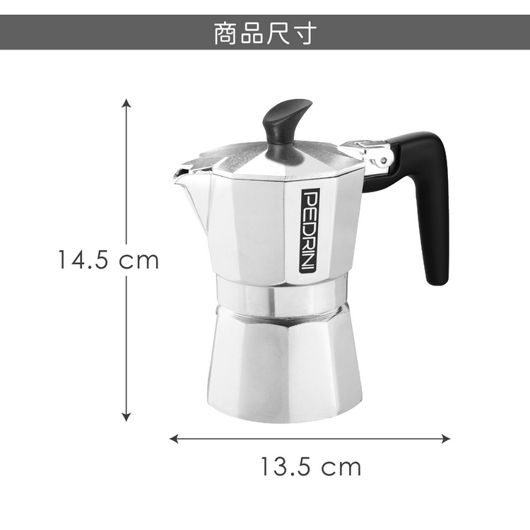 品牌:義大利 PEDRINI材質:食品級鋁合金EN601、矽膠、尼龍尺寸:含壺耳長 13.5 x 寬 8 x 高 14.5 cm;底徑 7 cm重量:310 g產地:中國容量:約 100 ml (2 杯量)