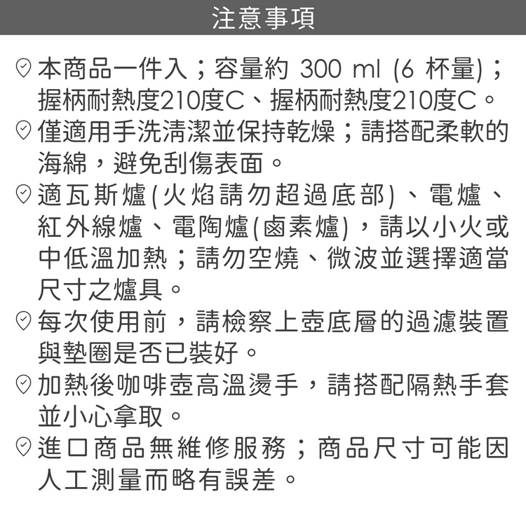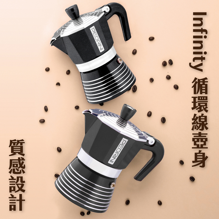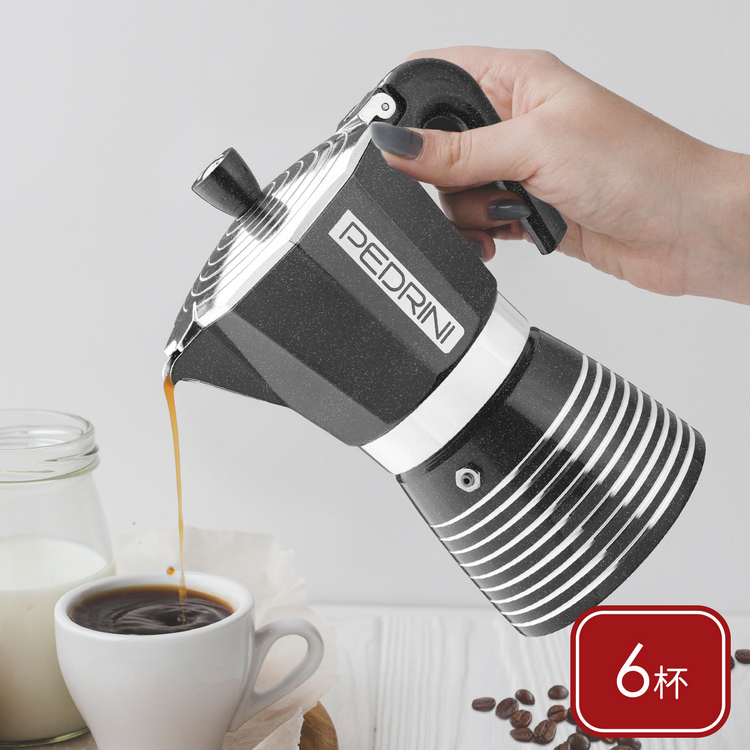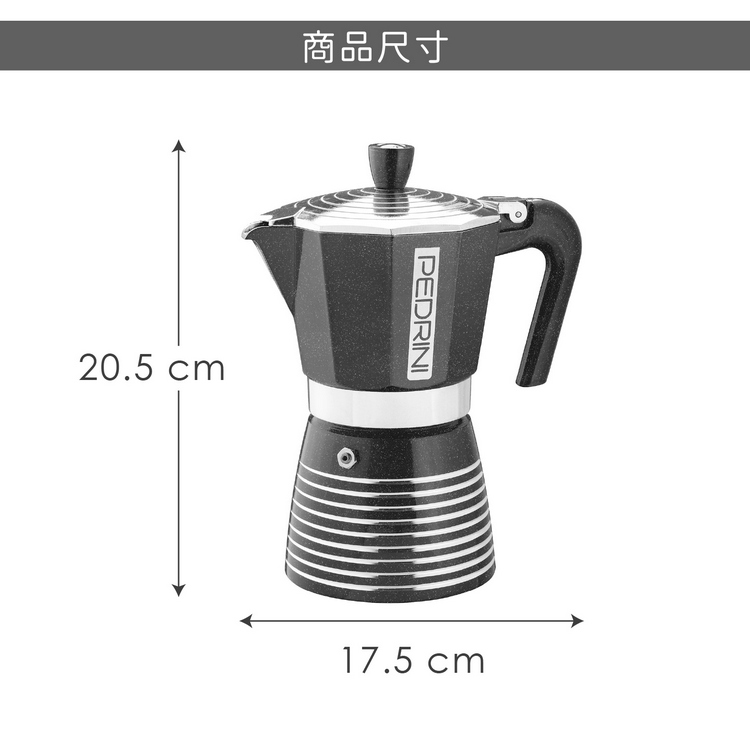 品牌:義大利 PEDRINI材質:食品級鋁合金EN601、矽膠、尼龍尺寸:含壺耳長 17.5 x 寬 10.5 x 高 20.5 cm;底徑 9 cm重量:555 g產地:中國容量:約 300 ml (6杯量)