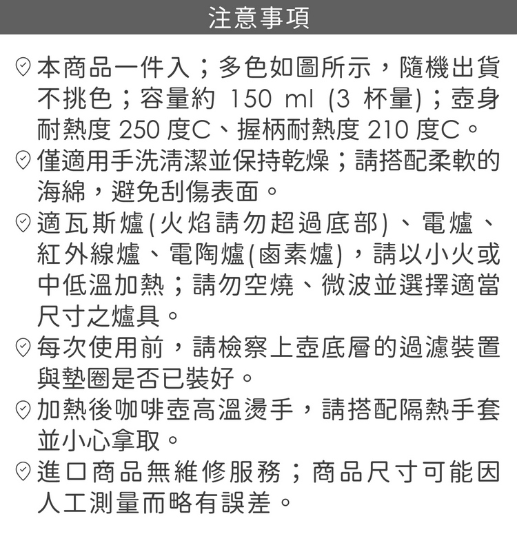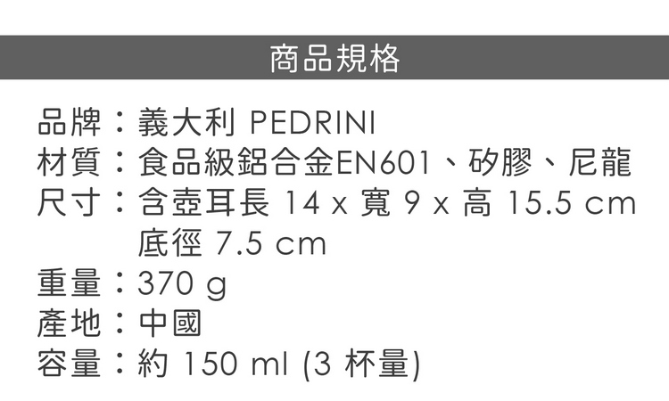 品牌:義大利 PEDRINI材質:食品級鋁合金EN601、矽膠、尼龍尺寸:含壺耳長 14 x 寬 9 x 高 15.5 cm;底徑 7.5 cm重量:370 g產地:中國容量:約 150 ml (3 杯量)