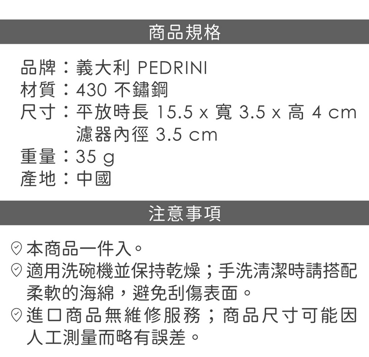 品牌:義大利 PEDRINI材質:430 不鏽鋼尺寸:平放時長 15.5 x 寬 3.5 x 高 4 cm;濾器內徑 3.5 cm重量:35 g產地:中國