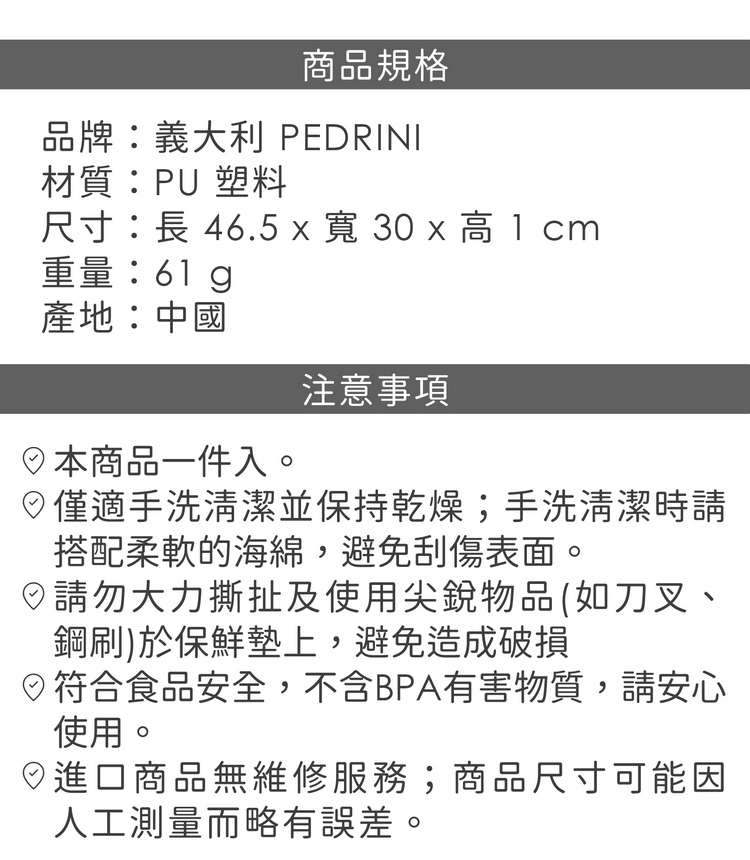 品牌:義大利 PEDRINI材質:PU 塑料尺寸:長 46.5 x 寬 30 x 高 1 cm重量:61 g產地:中國