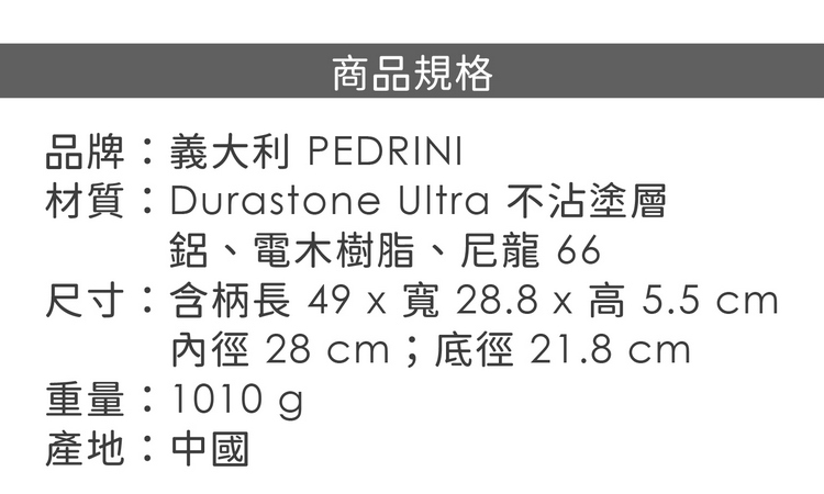 品牌:義大利 PEDRINI材質:Durastone Ultra 不沾塗層、鋁、電木樹脂、尼龍 66尺寸:含柄長 49 x 寬 28.8 x 高 5.5 cm;內徑 28 cm;底徑 21.8 cm重量:1010 g產地:中國