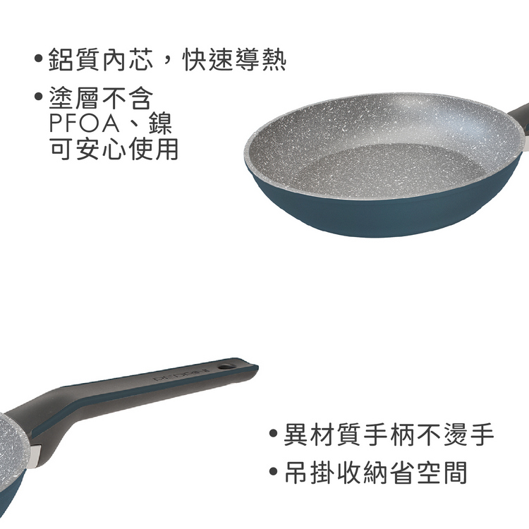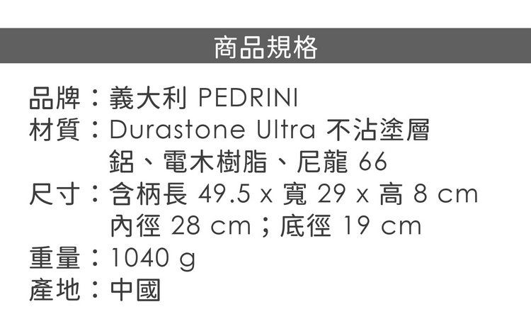 品牌:義大利 PEDRINI材質:Durastone Ultra 不沾塗層、鋁、電木樹脂、尼龍 66尺寸:含柄長 49.5 x 寬 29 x 高 8 cm;內徑 28 cm;底徑 19 cm重量:1040 g產地:中國