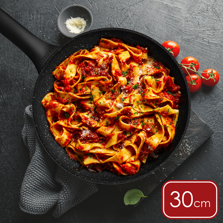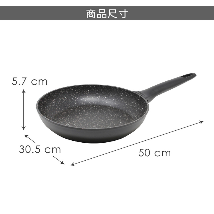 品牌:義大利 PEDRINI材質:Durastone Ultra 不沾塗層、鋁、電木樹脂尺寸:含柄長 50 x 寬 30.5 x 高 5.7 cm;內徑 30 cm;底徑 23.8 cm重量:1060 g產地:中國