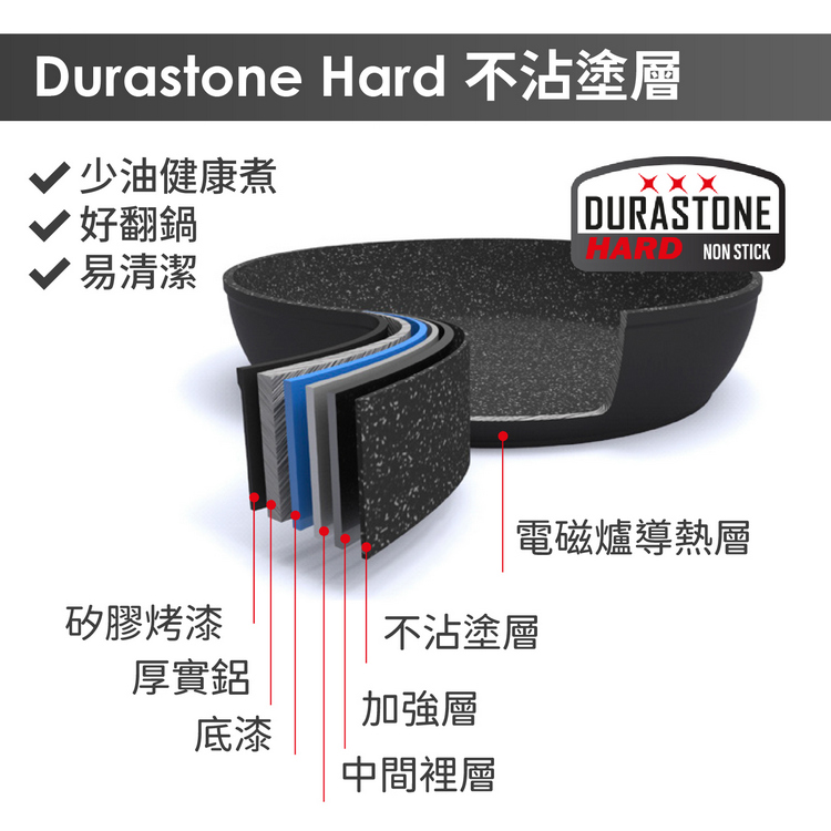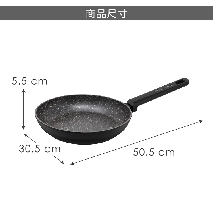 品牌:義大利 PEDRINI材質:Durastone Hard 不沾塗層、鋁、電木樹脂、尼龍 66尺寸:含柄長 50.5 x 寬 30.5 x 高 5.5 cm;內徑 30 cm;底徑 23.8 cm重量:1020 g產地:中國