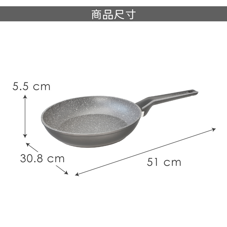 品牌:義大利 PEDRINI材質:Durastone Ultra 不沾塗層、鋁、電木樹脂、尼龍 66尺寸:含柄長 51 x 寬 30.8 x 高 5.5 cm;內徑 30 cm;底徑 22.8 cm重量:1100 g產地:中國
