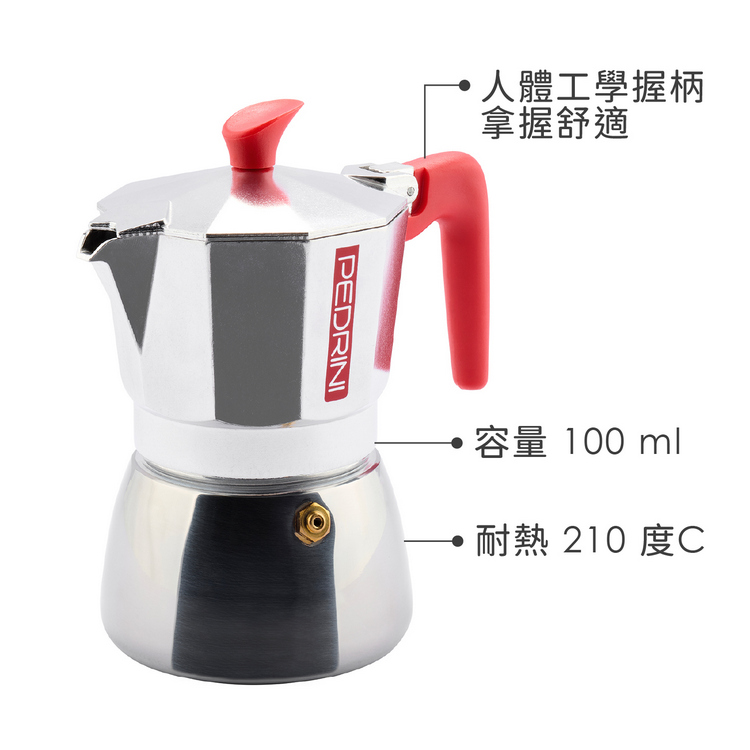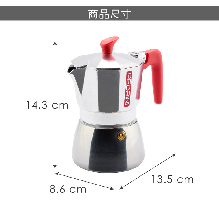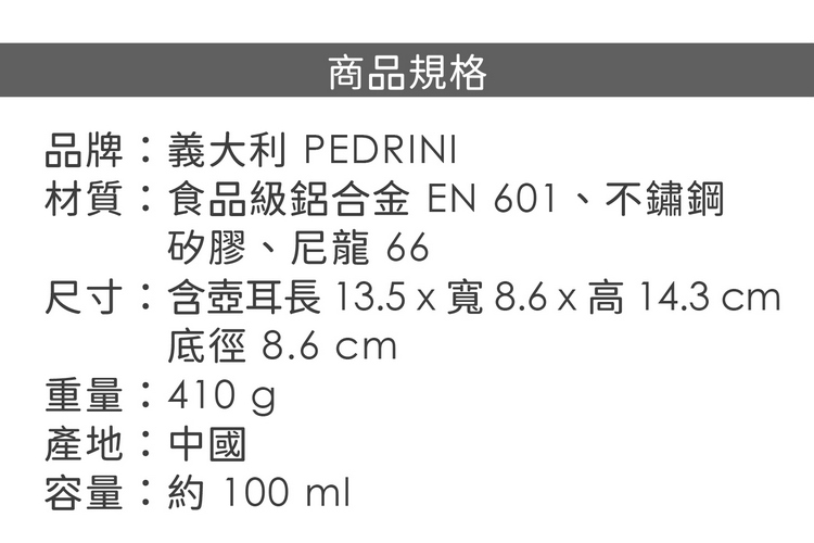品牌:義大利 PEDRINI材質:食品級鋁合金 EN 601、不鏽鋼、矽膠、尼龍 66尺寸:含壺耳長 13.5 x 寬 8.6 x 高 14.3 cm;底徑 8.6 cm重量:410 g產地:中國容量:約 100 ml