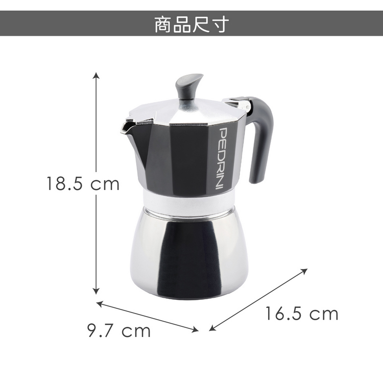 品牌:義大利 PEDRINI材質:食品級鋁合金 EN 601、不鏽鋼、矽膠、尼龍 66尺寸:含壺耳長 16.5 x 寬 9.7 x 高 18.5 cm;底徑 9.7 cm重量:640 g產地:中國容量:約 300 ml