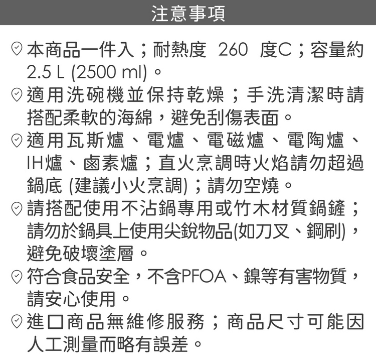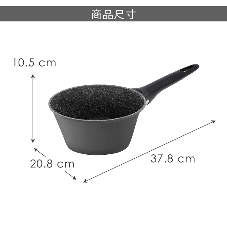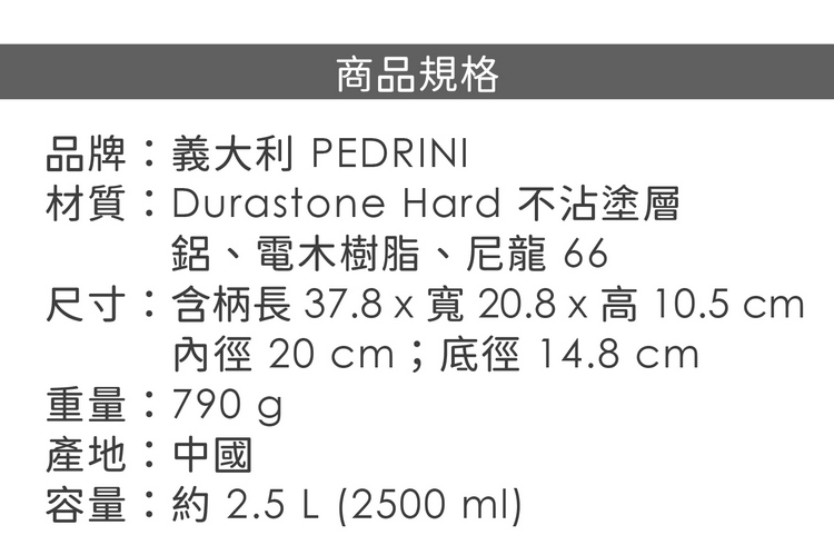 品牌:義大利 PEDRINI材質:Durastone Hard 不沾塗層、鋁、電木樹脂、尼龍 66尺寸:含柄長 37.8 x 寬 20.8 x 高 10.5 cm;內徑 20 cm;底徑 14.8 cm重量:790 g產地:中國容量:約 2.5 L (2500 ml)