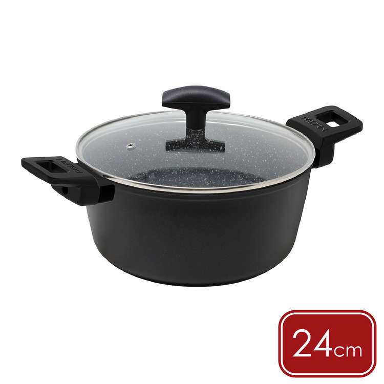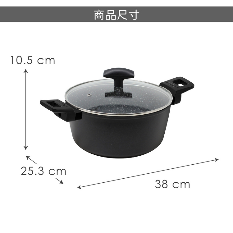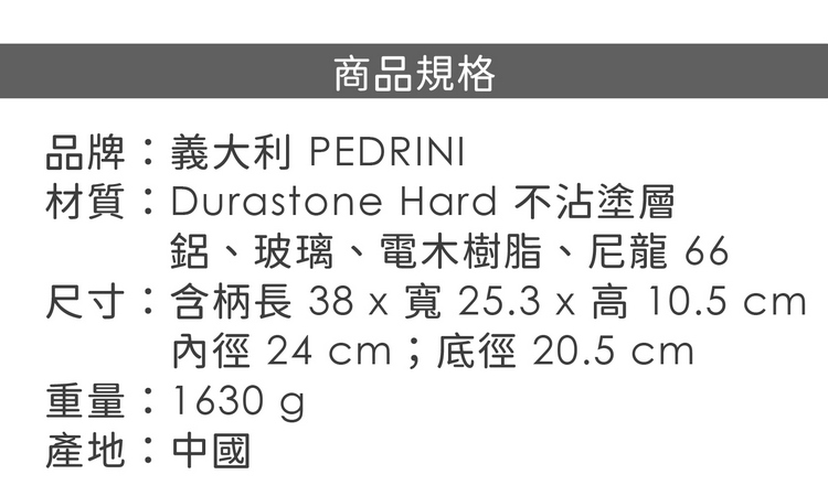 品牌:義大利 PEDRINI材質:Durastone Hard 不沾塗層、鋁、玻璃、電木樹脂、尼龍 66尺寸:含柄長 38 x 寬 25.3 x 高 10.5 cm;內徑 24 cm;底徑 20.5 cm重量:1630 g產地:中國