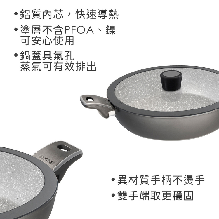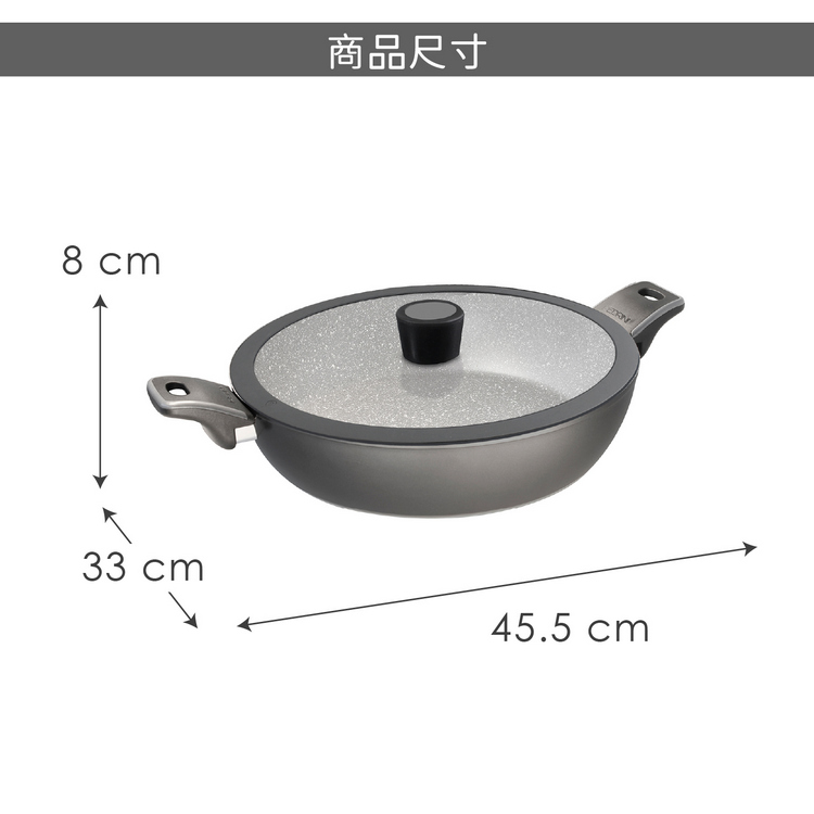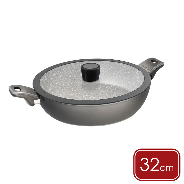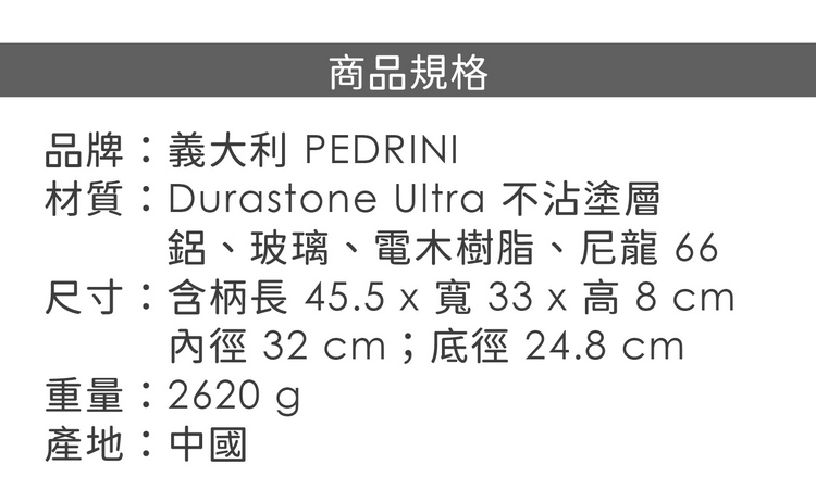 品牌:義大利 PEDRINI材質:Durastone Ultra 不沾塗層、鋁、玻璃、電木樹脂、尼龍 66尺寸:含柄長 45.5 x 寬 33 x 高 8 cm;內徑 32 cm;底徑 24.8 cm重量:2620 g產地:中國