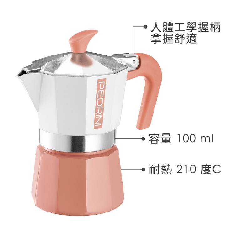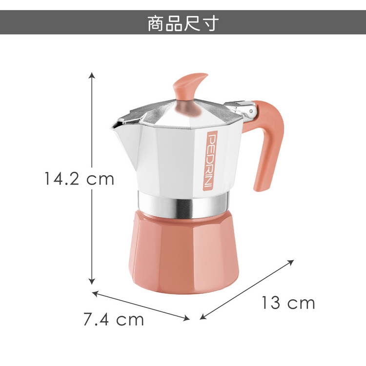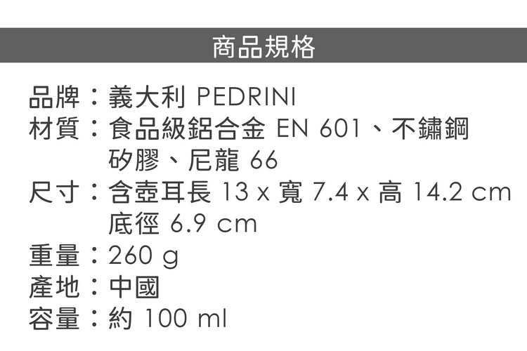 品牌:義大利 PEDRINI材質:食品級鋁合金 EN 601、矽膠、尼龍 66尺寸:含壺耳長 13 x 寬 7.4 x 高 14.2 cm;底徑 6.9 cm重量:260 g產地:中國容量:約 100 ml
