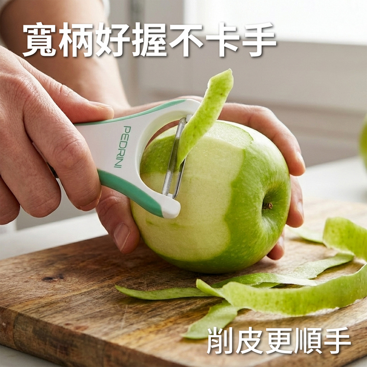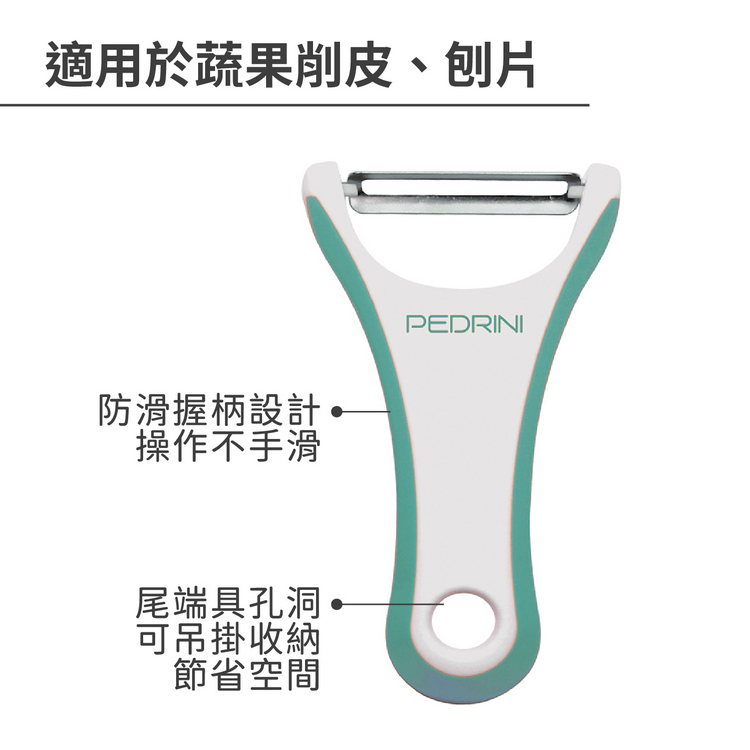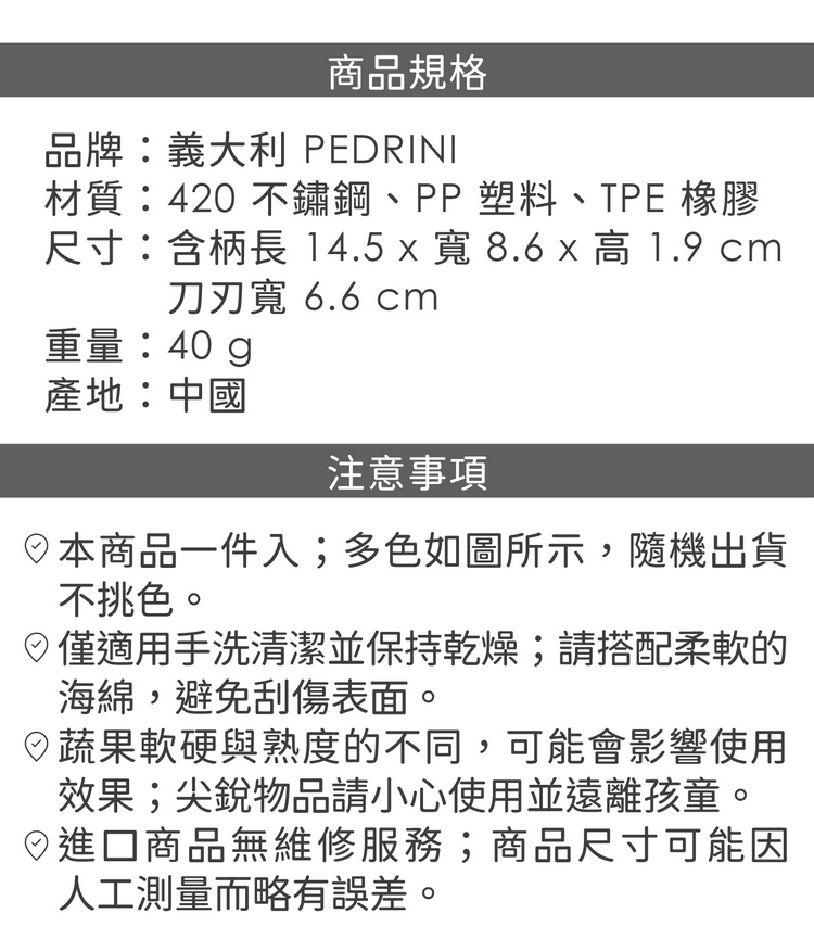 品牌:義大利 PEDRINI材質:420 不鏽鋼、PP 塑料、TPE 橡膠 尺寸:含柄長 14.5 x 寬 8.6 x 高 1.9 cm;刀刃寬 6.6 cm重量:40 g產地:中國