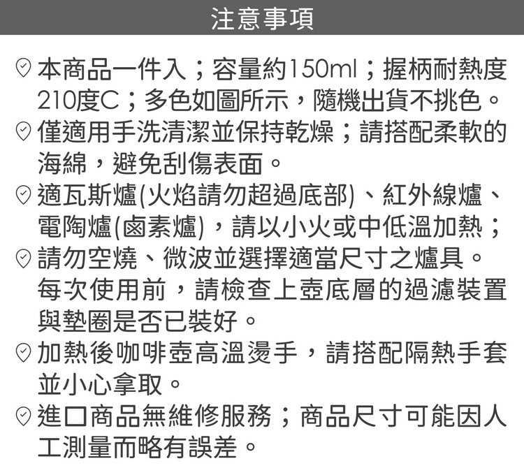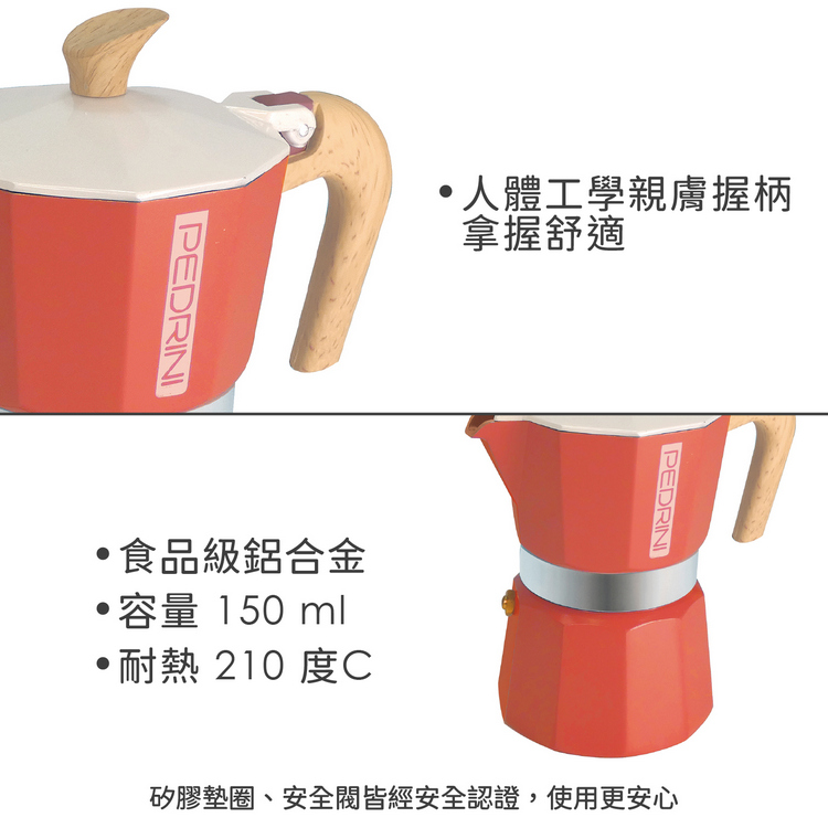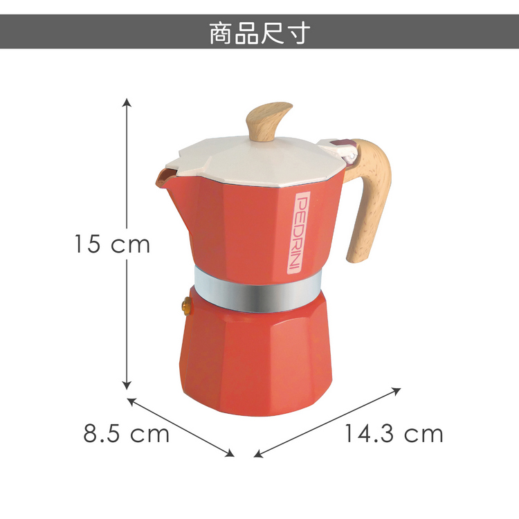 品牌:義大利 PEDRINI材質:食品級鋁合金 EN601、矽膠、尼龍 66尺寸:含壺耳長 14.3 x 寬 8.5 x 高 15 cm;底徑 8 cm重量:330 g產地:中國容量:約 150 ml