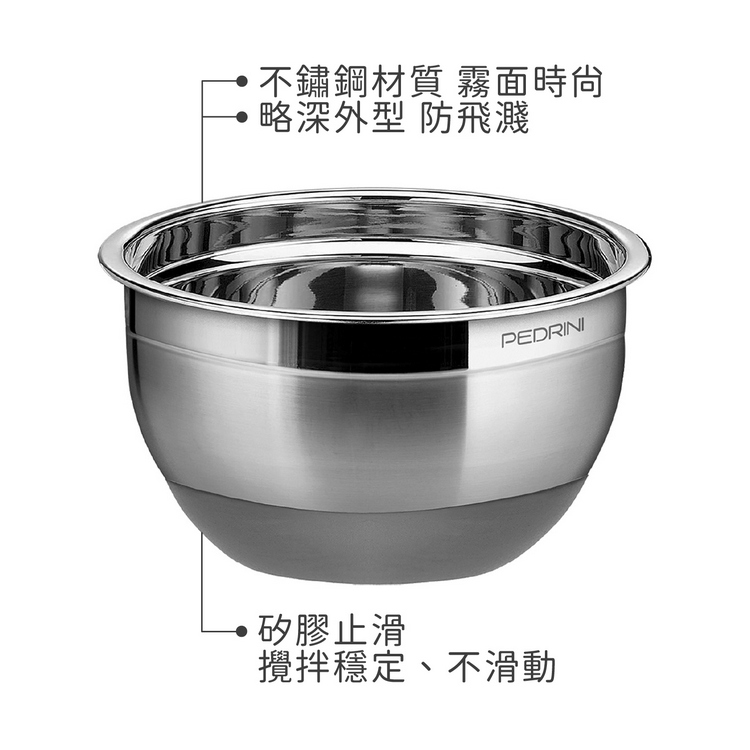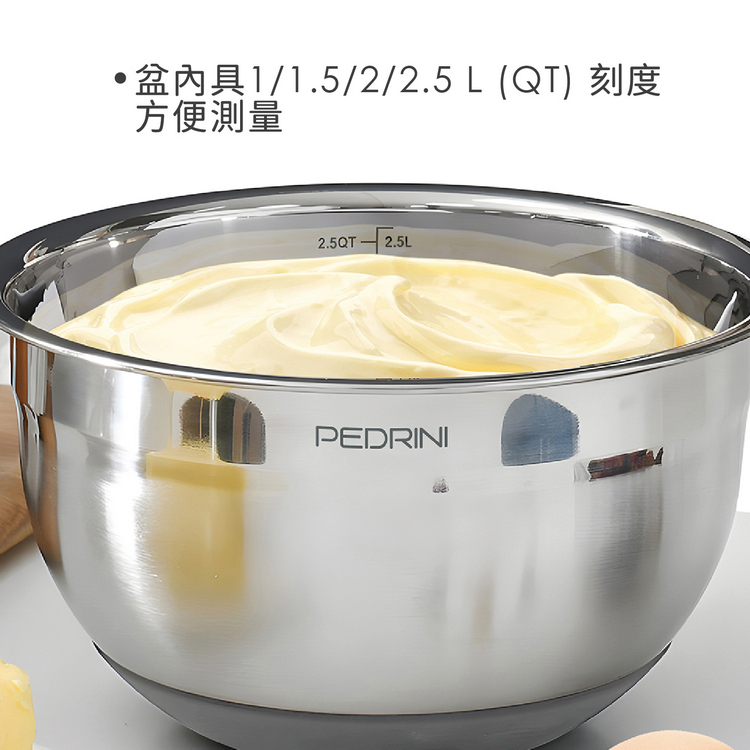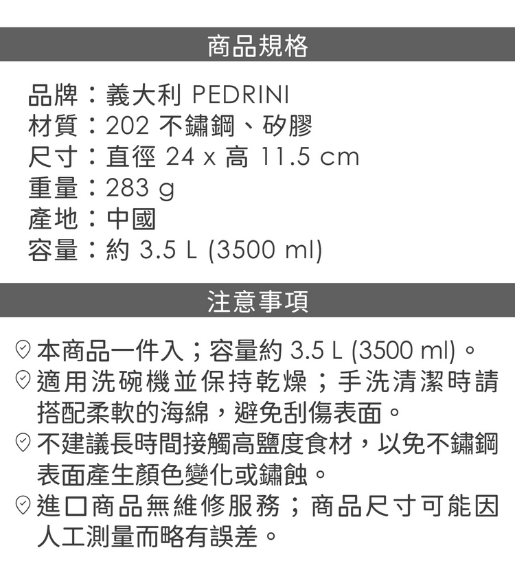 品牌:義大利 PEDRINI材質:202 不鏽鋼、矽膠尺寸:直徑 24 x 高 11.5 cm重量:280 g產地:中國容量:約 3.5 L (3500 ml)