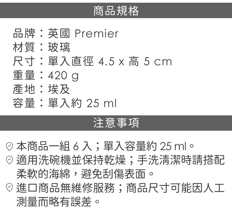 品牌:英國 Premier材質:玻璃尺寸:單入直徑 4.5 x 高 5 cm容量:單入約 25 ml重量:420 g產地:埃及備註:進口商品無維修服務;商品尺寸可能因人工測量而略有誤差