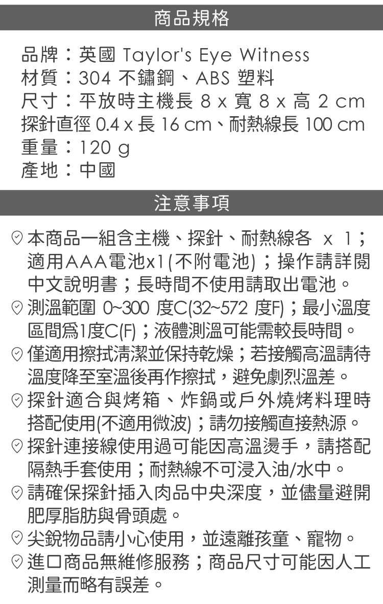 品牌:英國 Taylors Eye Witness材質:316 不鏽鋼、ABS 塑料尺寸:平放時主機長 8 x 寬 8 x 高 2 cm、探針直徑 0.4 x 長 16 cm、耐熱線長 100 cm重量:120 g產地:中國備註:進口商品無維修服務;商品尺寸可能因人工測量而略有誤差