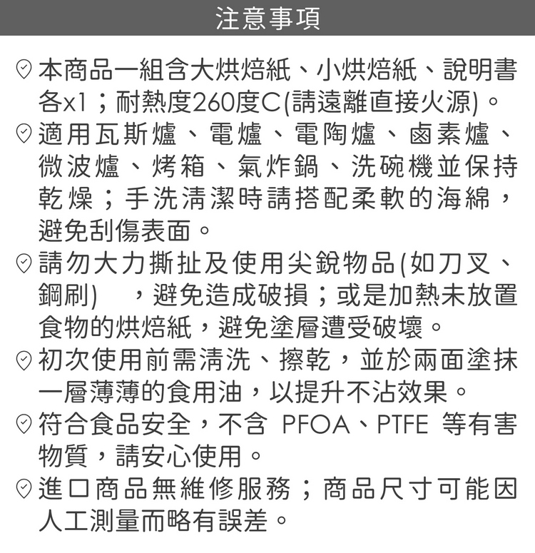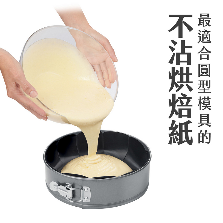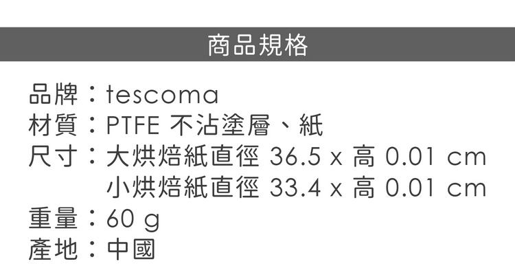 品牌:tescoma材質:PTFE 不沾塗層、紙尺寸:大烘焙紙直徑 36.5 x 高 0.01 cm;小烘焙紙直徑 33.4 x 高 0.01 cm重量:60 g產地:中國