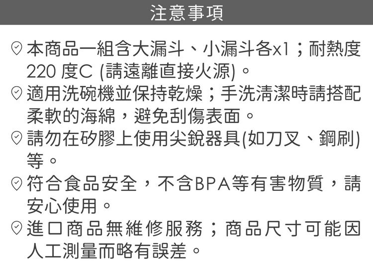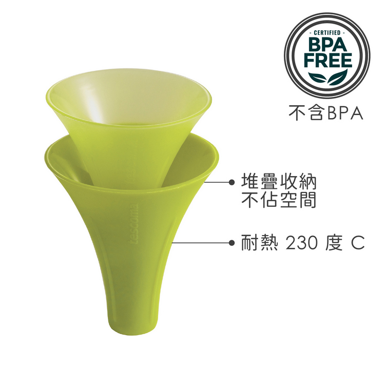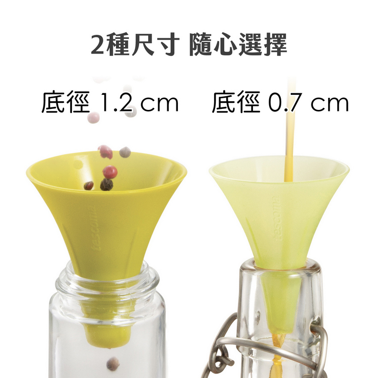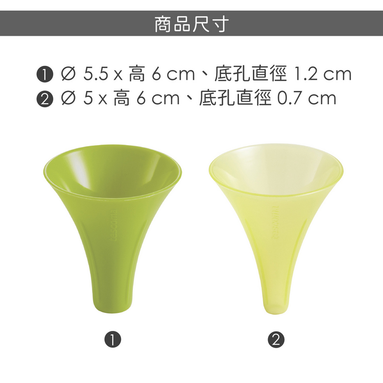 品牌:tescoma材質:矽膠尺寸:大漏斗直徑 5.5 x 高 6 cm、底孔直徑 1.2 cm;小漏斗直徑 5 x 高 6 cm、底孔直徑 0.7 cm重量:30 g產地:中國