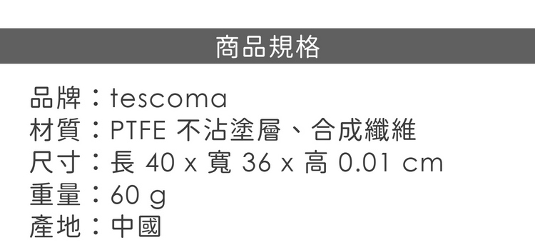 品牌:tescoma材質:PTFE 不沾塗層、合成纖維尺寸:長 40 x 寬 36 x 高 0.01 cm重量:60 g產地:中國