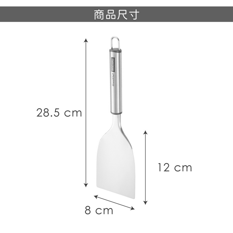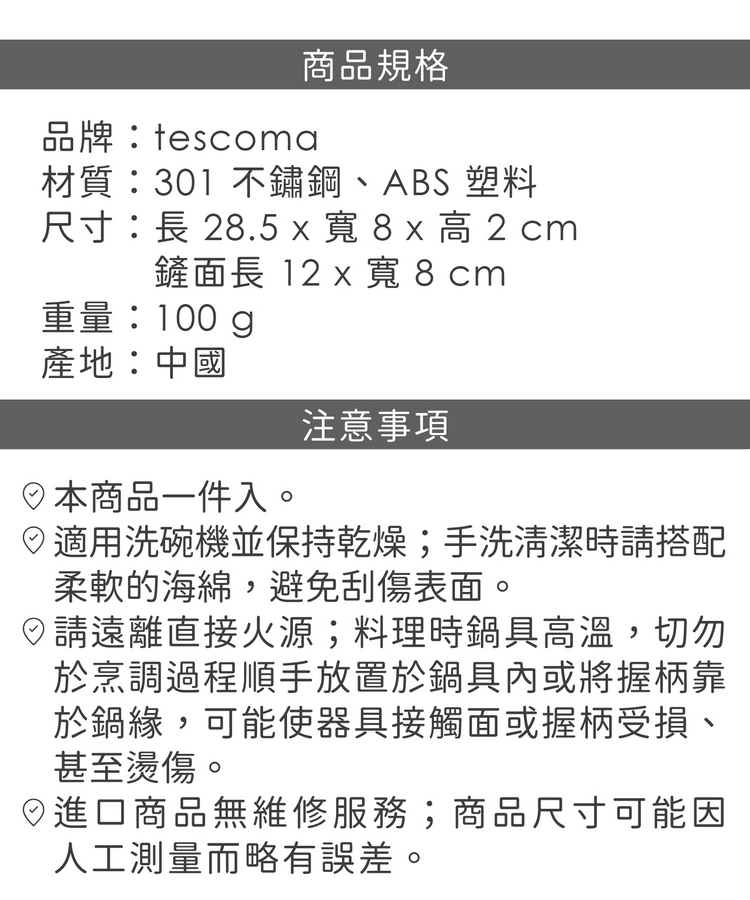 品牌:tescoma材質:301 不鏽鋼、ABS 塑料尺寸:長 28.5 x 寬 8 x 高 2 cm;鏟面長 12 x 寬 8 cm重量:100 g產地:中國