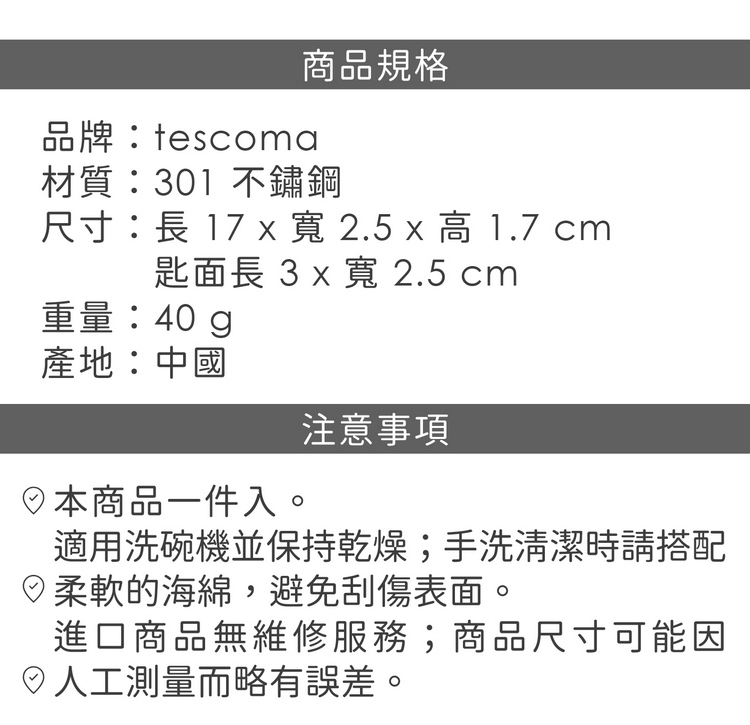 品牌:tescoma材質:301 不鏽鋼尺寸:長 17 x 寬 2.5 x 高 1.7 cm;匙面長 3 x 寬 2.5 cm重量:40 g產地:中國