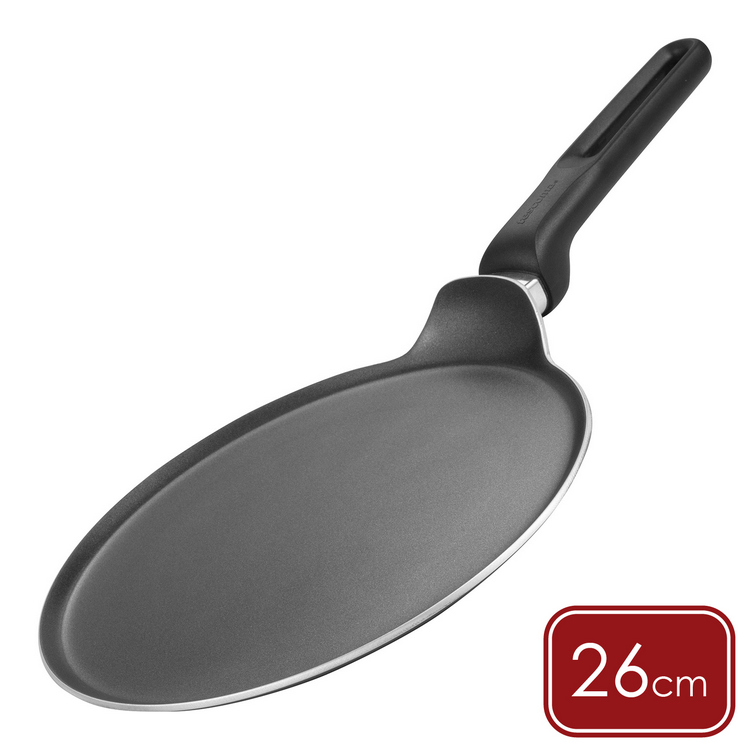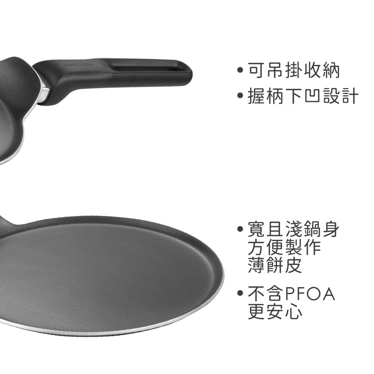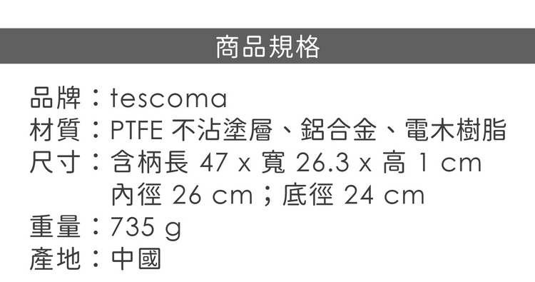 品牌:tescoma材質:PTFE 不沾塗層、鋁合金、電木樹脂尺寸:含柄長 47 x 寬 26.3 x 高 1 cm;內徑 26 cm;底徑 24 cm重量:735 g產地:中國