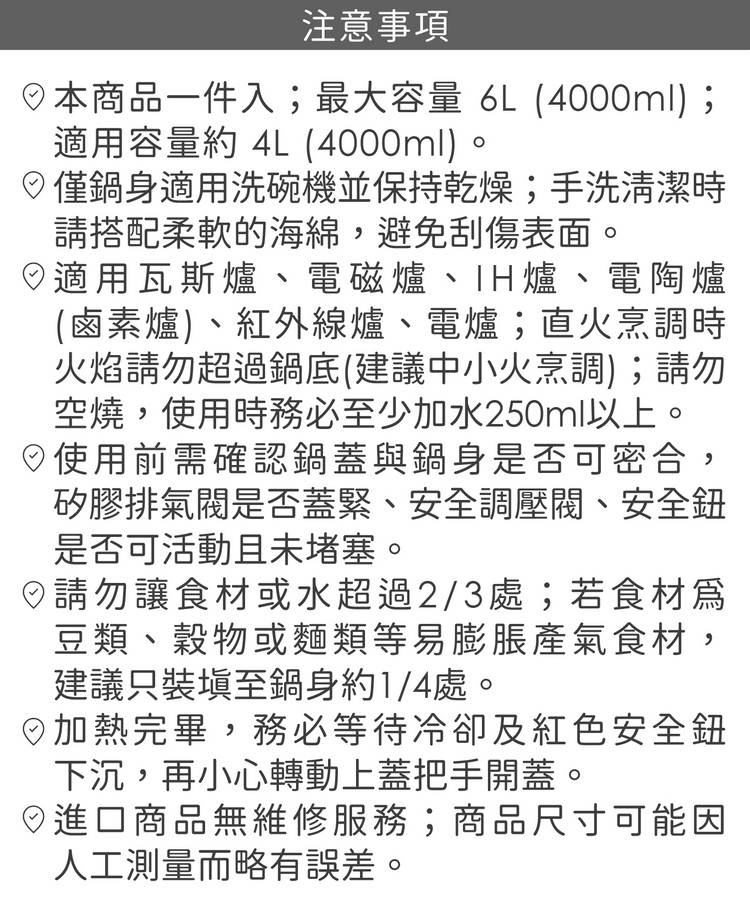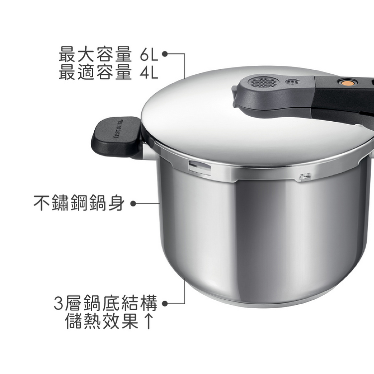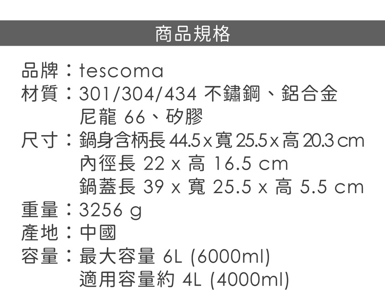 品牌:tescoma材質:301/304/434 不鏽鋼、鋁合金、尼龍 66、矽膠尺寸:鍋身含柄長 44.5 x 寬 25.5 x 高 20.3 cm;內徑長 22 x 高 16.5 cm;鍋蓋長 39 x 寬 25.5 x 高 5.5 cm重量:3256 g產地:中國容量:最大容量 6L (6000ml) ;適用容量約 4L (4000ml)
