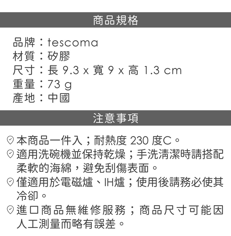 品牌:tescoma材質:矽膠尺寸:長 9.3 x 寬 9 x 高 1.3 cm重量:73 g產地:中國