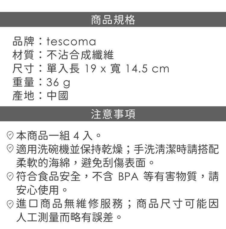 品牌:tescoma材質:不沾合成纖維尺寸:單入長 19 x 寬 14.5 cm重量:36 g產地:中國
